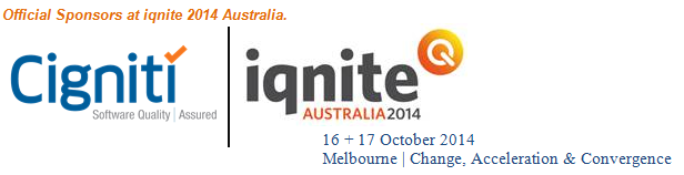 We’re excited to be sponsoring iqnite 2014 Australia, the conference for software quality and testing. The conference theme this year is Change, Acceleration, Convergence. iqnite 2014 Australia will be focusing on what is driving change in the software quality industry, and the implications for both individual software quality practitioners and organisations wanting to manage their ICT risk in a rapidly evolving market. The conference will feature international and local keynote presenters, including Caroline Carder, 2013 Australian Software Testing Individual Contribution award winner, and Mark Toomey, IT Governance specialist and 2012 ICT Professional of the Year.