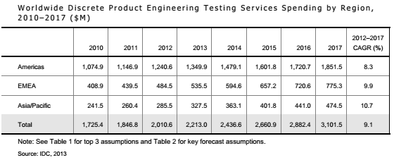 The predicted spending for discrete product engineering testing services for Americas region is estimated to grow to nearly $1.9 billion in 2017, while the EMEA and APAC regions are estimated to reach $0.8 billion and $0.5 billion, respectively, in 2017.